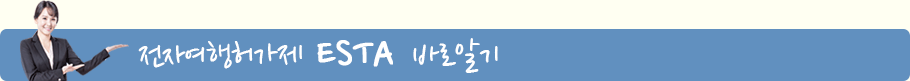 ESTA는 전자여행허가제를 뜻하며, 미국에 방문하고자 하는 사람이 사전에 미국정부가 지정한 인터넷 사이트에 접속하여 자신에 관한 정보를 입력하고 전자적으로 발송 한후, 미국 정부로 부터 입국 가능 여부를 사전에 통보 받도록 하는 시스템 입니다.
