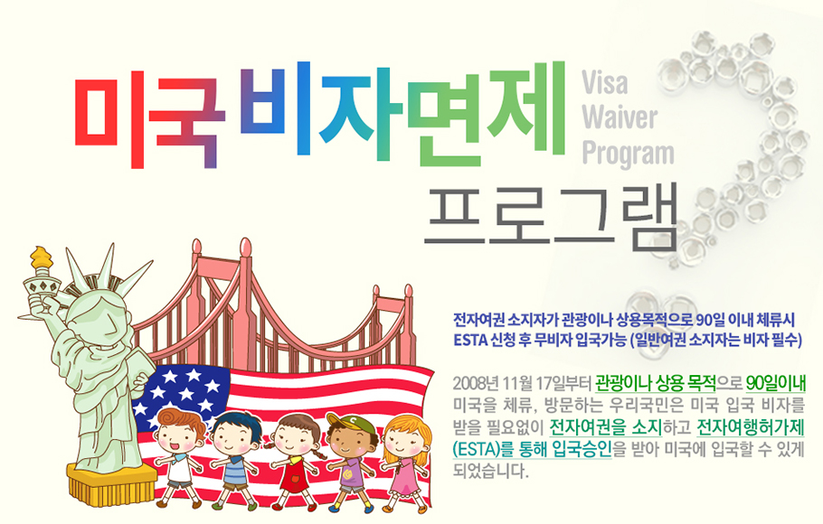 비자면제 프로그램은 전자여권 소지자에 한하며, 미국 입국 전 ESTA(전자여행허가제)에 접속하여 간단한 자신의 신상정보 등을 입력한 후에, 미국 정부로부터 입국 승인을 받아 미국에 입국할 수 있습니다.